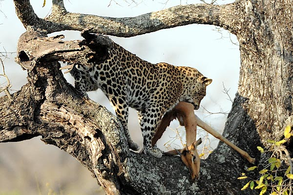 L’autora de la nota, Eva van den Berg, destaca el problema de l’entrada de furtius que han malmès sobretot la població de rinoceronts. Apareixen dues fotos. La principal, realitzada conjuntament amb Lluís Solé, mostra un lleopard arrossegant a dalt d’un arbre un jove impala que acaba de caçar. Aquí a baix veureu una foto de la mateixa sèrie en la que es pot apreciar la ferida mortal al coll. L’amic Darío Sirerol titula aquesta foto així: “Composició de lleopard i jove impala amb un marc i peu de fusta”.